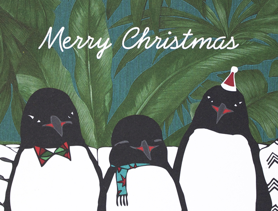 PINGUINE IM DSCHUNGEL - 'Cheese!' Mit überschaubarer Begeisterung posieren die Drei auf dem schneeweißen Sofa und träumen vom tropischen Dschungel auf der Tapete.