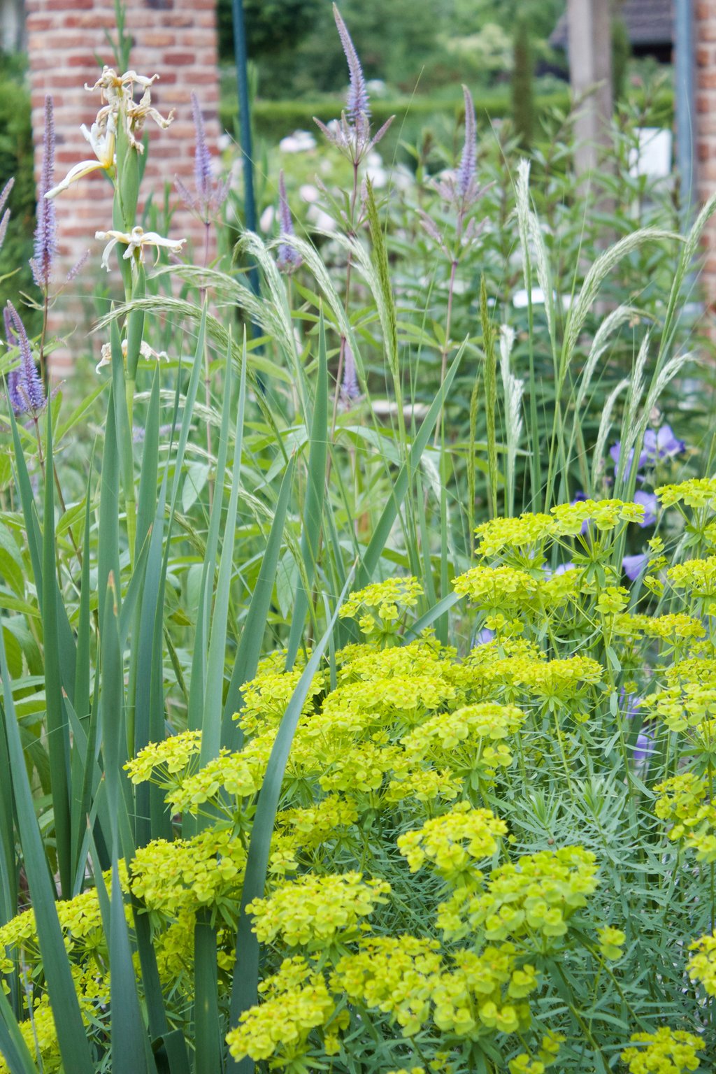(oben) Im "Roten Beet" herrscht nur noch das Gesetz des Stärkeren, in dem Fall triumphiert die Zypressenwolfsmilch. Witwenblume, Leimkraut und Dost verziehen sich dahin, wo mehr Raum bleibt.. Hier muß ich wohl mal wieder einschreiten, ansonsten zieht der Steppensalbei auch noch um.
