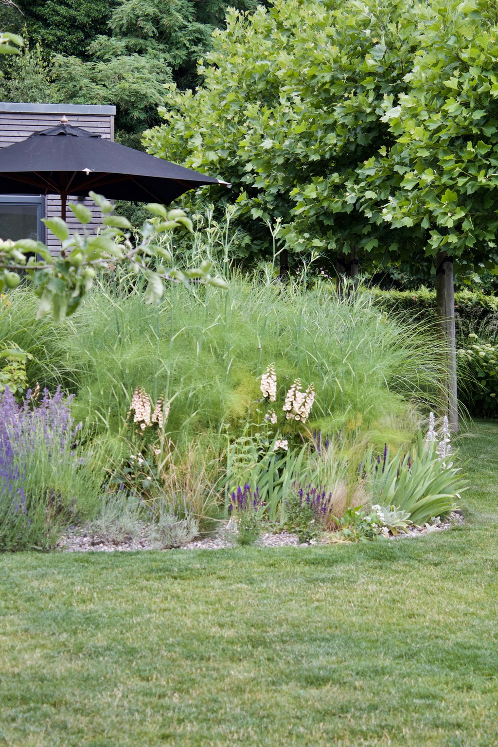 Bei dem Gras handelt es sich um das Chinaschilf 'Gracillimus'. Davor habe ich eine Reihe Buchsbaum stehen und dahinter direkt eine abschließende Reihe mit Eiben.