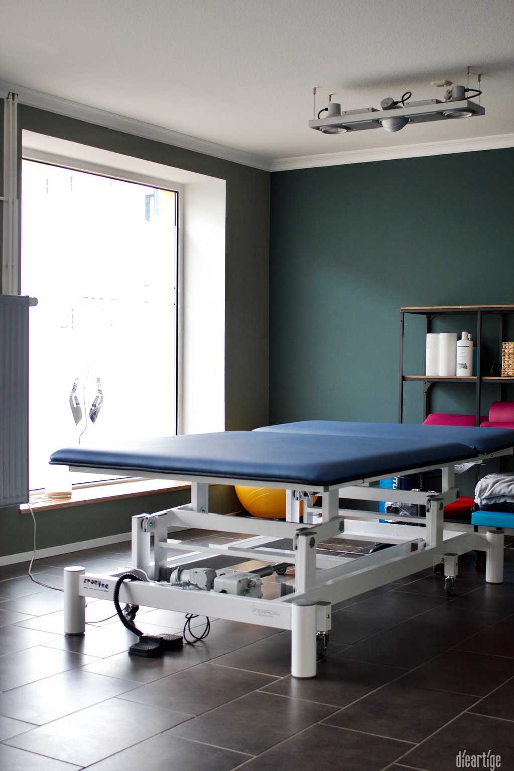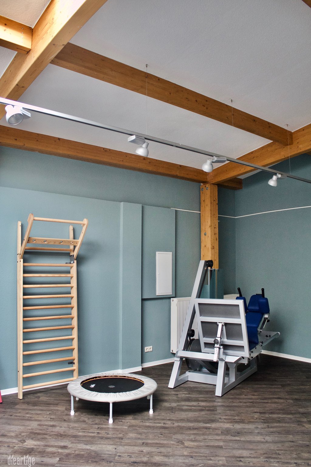 Innerhalb der Praxis - zentral und dennoch separat gelegen - bildet der große, mit einer Mindestraumhöhe von 3,15 m und einem großen Oberlicht bestückte Sportraum, das Herz der Praxis.