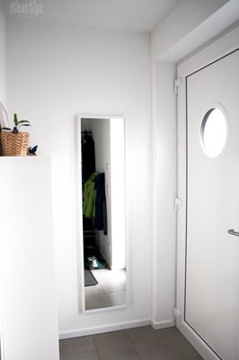 Der Flur erhielt als Willkommensgruß einen grauen Baumwollteppich mit Holztischchen darauf, für immer frische Blumen.