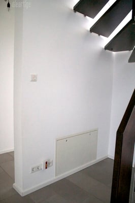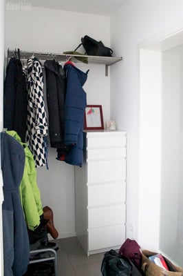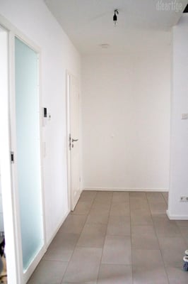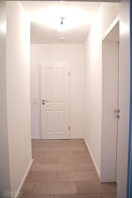 Um dem Besucher mit einem sanften Übergang von Außen ins Innen zu holen, habe ich im Windfang einen hellen Blauton gewählt. Die Graue Wand hinter der Garderobe vermittelt bereits in den Hauptflur. Außerdem verträgt sie den steten Klamottenwechsel besser und läßt die Kugeln der "Hang it all" (Vitra) noch bunter strahlen. Ergänzt wird der Garderobenbereich mit einem passgenauen Holzablage/Sitzbrett, einer Kleiderstange sowie einer kleinen filligranen Ablage - beides ebenfalls aus Eiche.