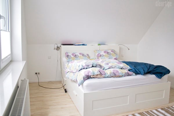 Nun schaffen der altrosafarbene Sessel, ein großer runder weicher Teppich, leichte lichte Gardinen, die große Kugelleuchte, farblich passende Bettwäsche und die Wandfarben Rosé und Grau eine absolut ruhige und entspannende Atmosphäre.