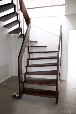Als Hommage an drei große, alte Birken, die vor dem Bau des Hauses auf dem Grundstück wuchsen, "stehen" nun einige junge Birken in Form einer 5 m hohen schwarz-weißen Fototapete im Flur. Somit vermittelt nicht nur die dunkle rot-braune Treppe zwischen unten und oben.